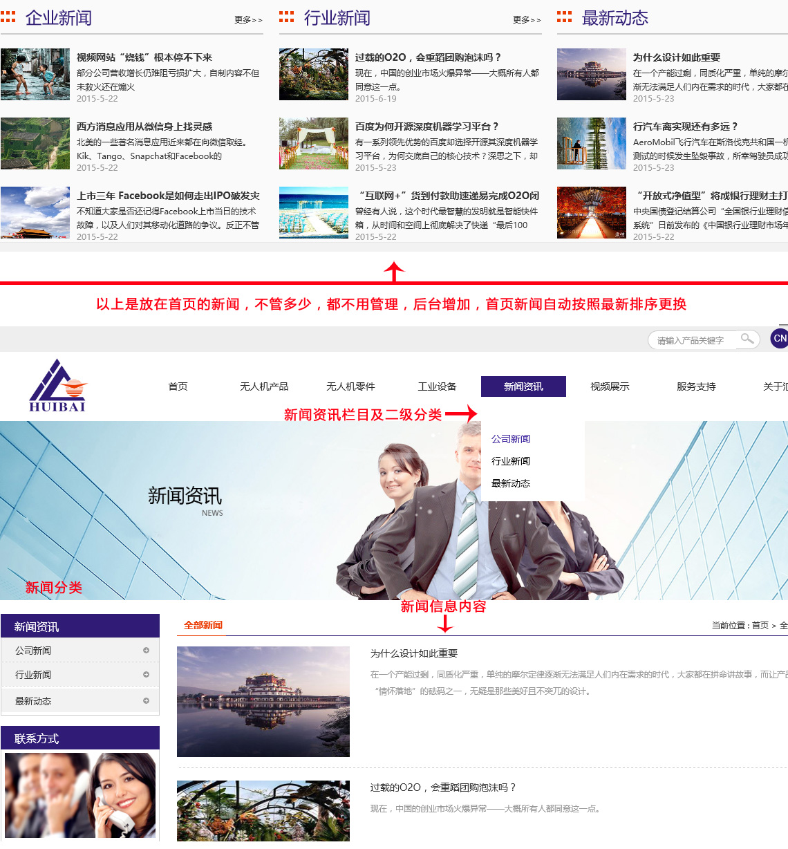 新聞資訊一般分為首頁新聞、新聞分類和內(nèi)頁新聞三部分,首頁新聞一般無需設(shè)置,不像首頁公司簡介一樣,還需在零碎信息管理里面單獨(dú)修改,新聞在后臺自動(dòng)添加新增后,首頁新聞自動(dòng)增加,首頁新聞一般是依據(jù)最新添加排在前面;至于新聞分類和內(nèi)頁新聞主要是對應(yīng)后臺左側(cè)新聞分類(管理分類,添加分類)、新聞管理(管理信息、添加信息)兩個(gè)欄目,添加新聞的一般順序是先規(guī)劃好新聞資訊欄目下的二級分類,比如企業(yè)新聞、行業(yè)新聞、展會新聞、產(chǎn)品新聞等,優(yōu)先規(guī)劃好二級分類才好在添加新聞時(shí)進(jìn)行分類選擇,否則優(yōu)先添加新聞,再進(jìn)行分類,然后再點(diǎn)擊新聞進(jìn)行修改分類,多此一舉;